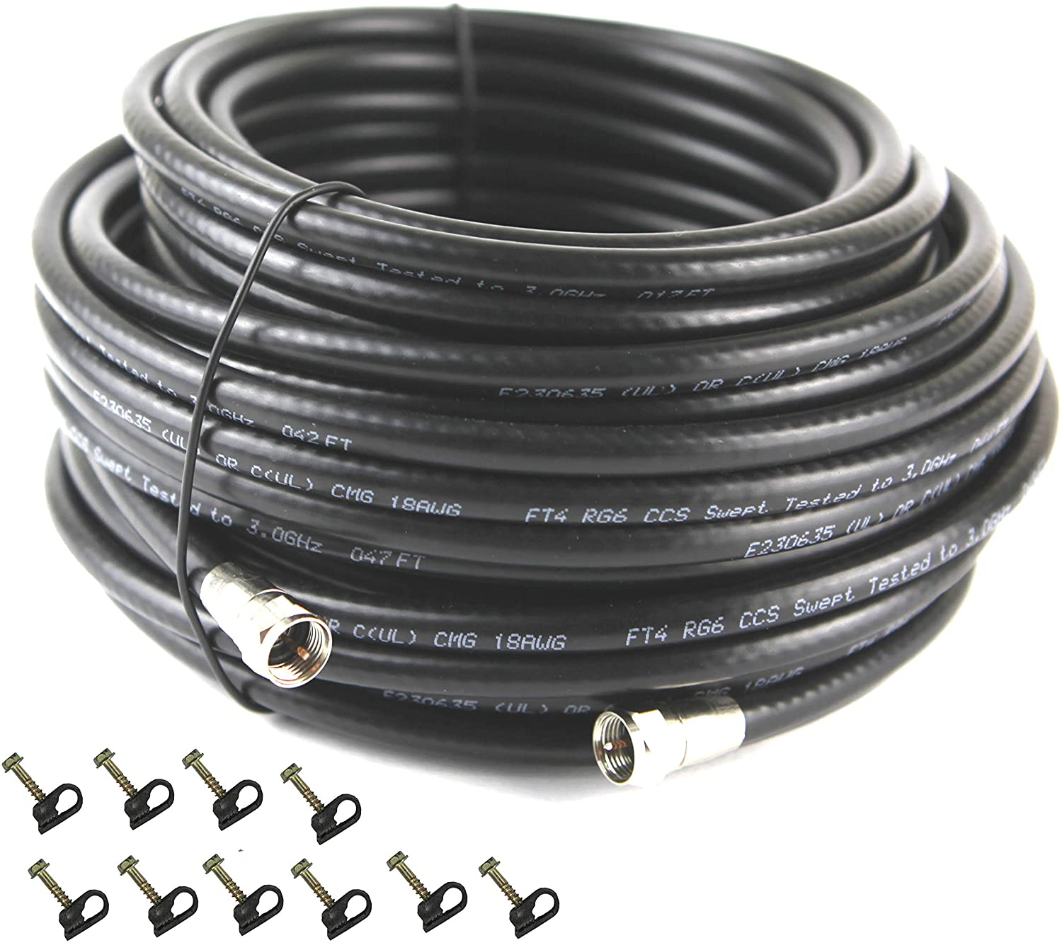 RG6 18AWg Copper Clad Steel50FT with Radial Crimp F Connectors with waterproof O ringsUL c(UL) CMG FT4 In Wall rated with authentic UL File number E230635For CATV, Satellite TV, Bell, Shaw tvComes with 10 flex cable clips